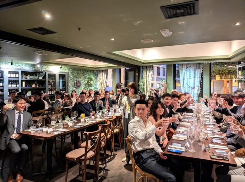 台灣旅英學生總會(SUROCUK)成立50週年,11日在倫敦舉行晚宴,有60多人出席,眾人舉杯慶祝。(中央社記者陳韻聿倫敦攝)