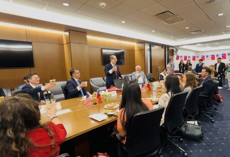 駐洛杉磯台北經濟文化辦事處長馬博元(站立者)會見亞利桑那州參眾議員,台美雙方用珍珠奶茶舉杯,慶祝雙方友誼。(駐洛杉磯辦事處提供,中央社記者林宏翰傳真)