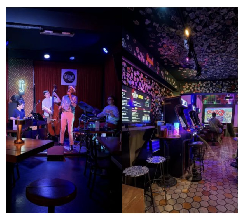 Foojohn Jazz Club的現場與空間配置,舞台與1樓街機遊戲並置,構成音樂、娛樂與社交交錯的場域,也形塑出其高度開放且可參與的現場氛圍(作者攝)