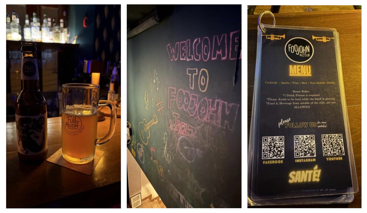 Foojohn Jazz Club的日常場景,吧台、手寫牆與菜單構成空間細節,讓人可以在音樂之外停留、移動與參與(作者攝)