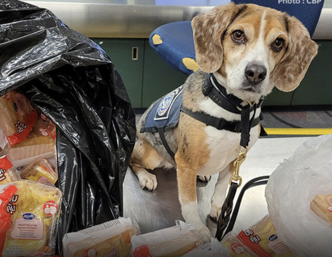 (台泰時報4月18日電)美國海關與邊境保護局(CBP)近日公布,一隻名為「梅拉」的K9緝查犬,在機場執勤時成功查獲來自泰國的違規食品,包含超過100份肉類三明治,因未依法申報,最終全數遭到沒收並銷毀。