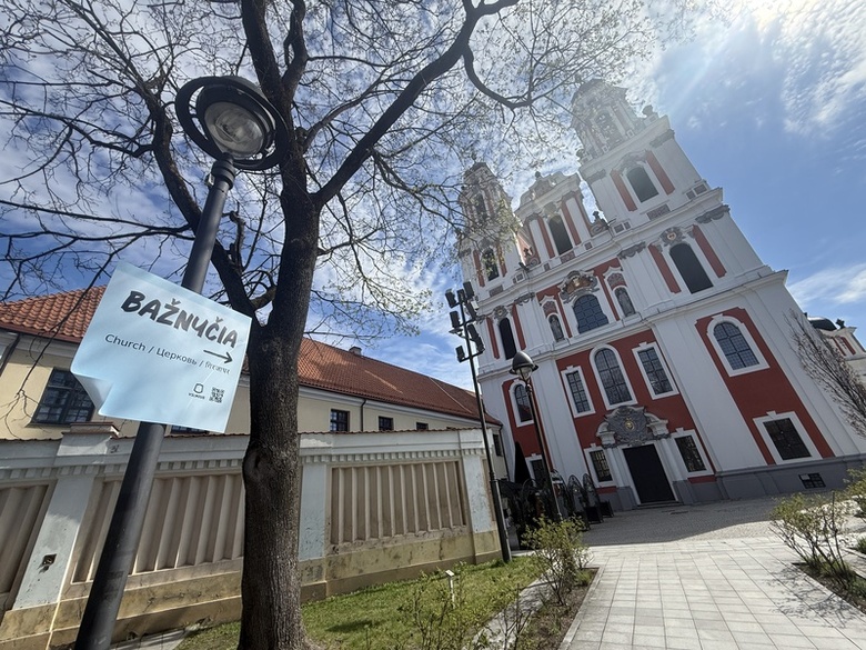 立陶宛首都維爾紐斯推動外籍居民語言融合,用創意方式幫助外國人學習立陶宛語。圖為維爾紐斯的聖凱瑟琳教堂,與標註著「教堂」立陶宛語的便利貼。(中央社記者游堯茹維爾紐斯攝)