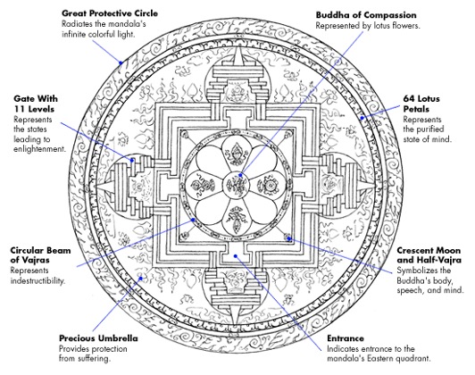 曼荼羅(Mandala)式的圖案布局,在佛教(特別是密宗)中象徵宇宙嚴謹且具層級性的秩序。它的幾何結構,由象徵和諧,圓滿的圓形與象徵佛土壇場的正方形交織而成,符合「天圓地方」的意義。