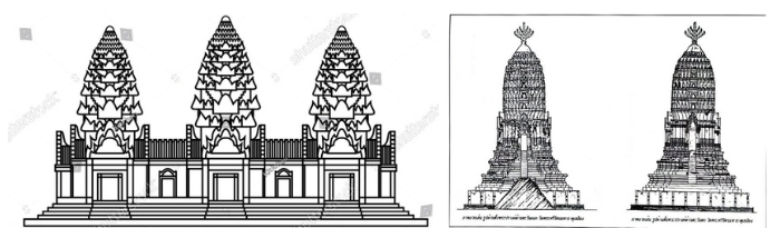 高棉帝國三峰塔(左),圖右為泰式風格的「普朗」「玉米穗軸」塔式