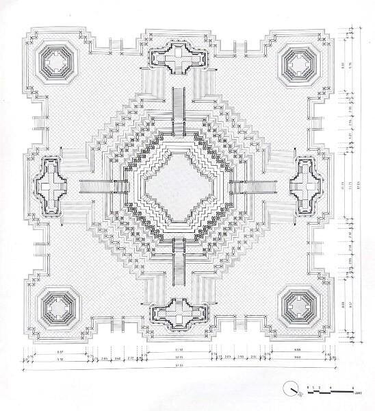 4條階梯位於主塔的4個方向(東南西北),代表通往須彌山的4個層級,大致上對應4大天王或4大洋。入口有中式石像門神和12生肖把守。階梯連結主塔塔基到一個高度,但是非常陡峭,一般遊客基於安全考量,都攀登至第二層參觀,不會再往上攀爬。斜十字形基座環繞4條階梯,也強化了曼荼羅圖騰的空間格局。