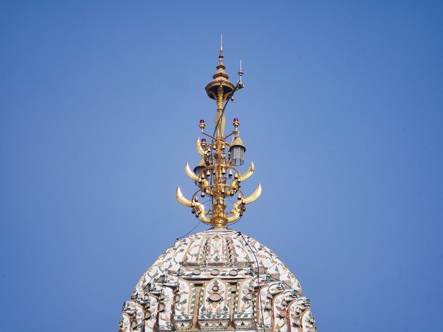 頂端的塔尖安插著1組七叉金戟(Nopphasun),象徵印度教主神濕婆神(Shiva,大自在天)的強大武器「三叉戟」(Trisula),也象徵著神聖至高無上的權威。塔尖上有頂王冠,原是爲「南農寺」(Wat Nang Nong Worawihan)佛像所鑄造的,拉瑪三世在位的1842年,主導中央主佛塔工程時,下令將王冠置於塔尖。依據泰國傳統建築學中,這種塔尖的戟狀物或王冠,其實就是用來引雷的避雷針。