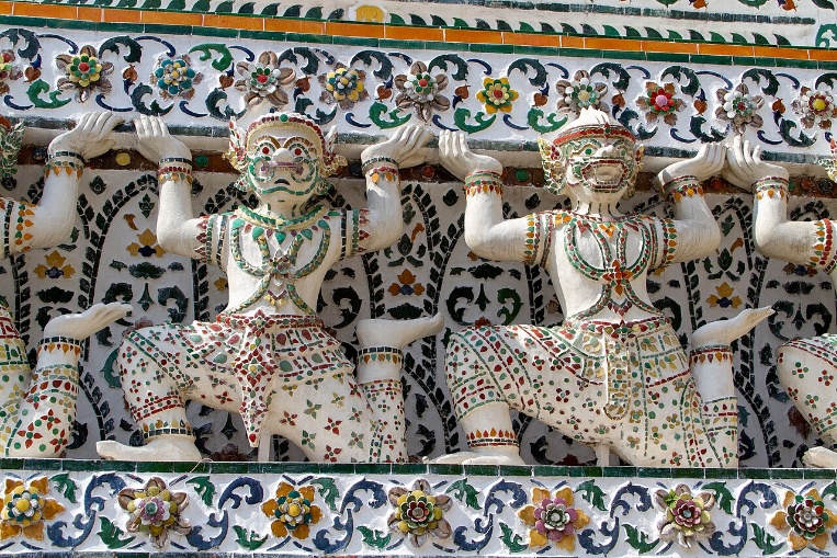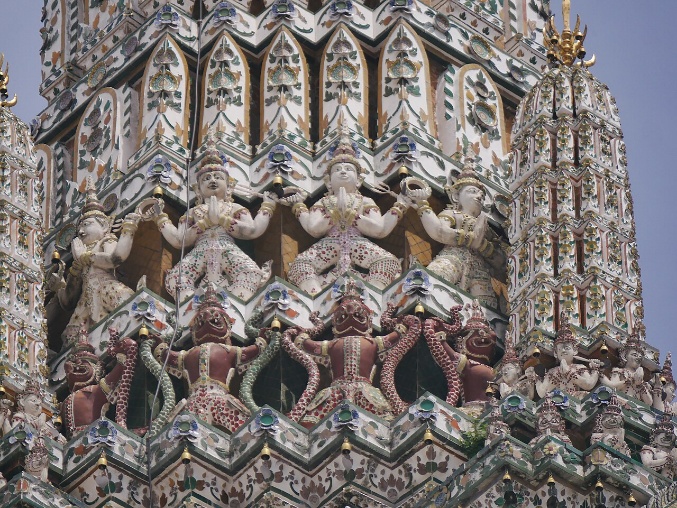 迦樓羅(Garuda)為毗濕奴的坐騎——大鵬金翅鳥,象徵皇室的權威與保護。塔的中段部分設4面壁龕,龕內供奉因陀羅(Indra,帝釋天),身騎3頭戰象愛羅婆多(Erawan)。因陀羅是統領天界的神王,也代表泰國的皇權,管轄氣候及人民的日常。
