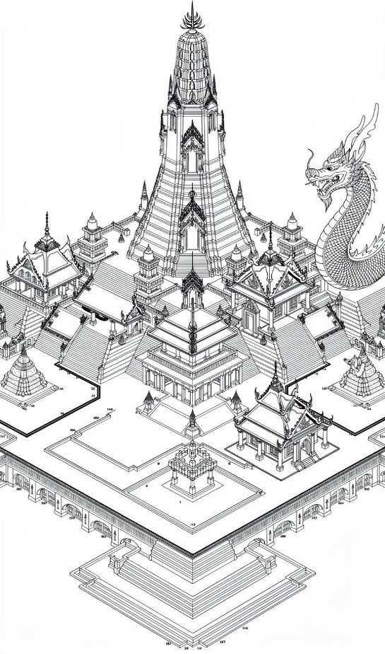 總結來說,「黎明寺」(Wat Arun)最重要的主塔布局,是上座部佛教與印度婆羅門教融合的宇宙觀,以「曼荼羅」(Mandala)為設計藍本,象徵著暹羅國王權在宇宙中秩序與神聖層級的展現。