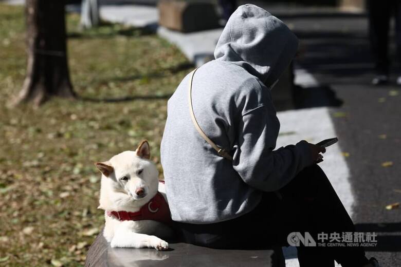 圖為公園裡下午有民眾帶著狗狗一起曬太陽,享受悠閒時光。(中央社檔案照片)