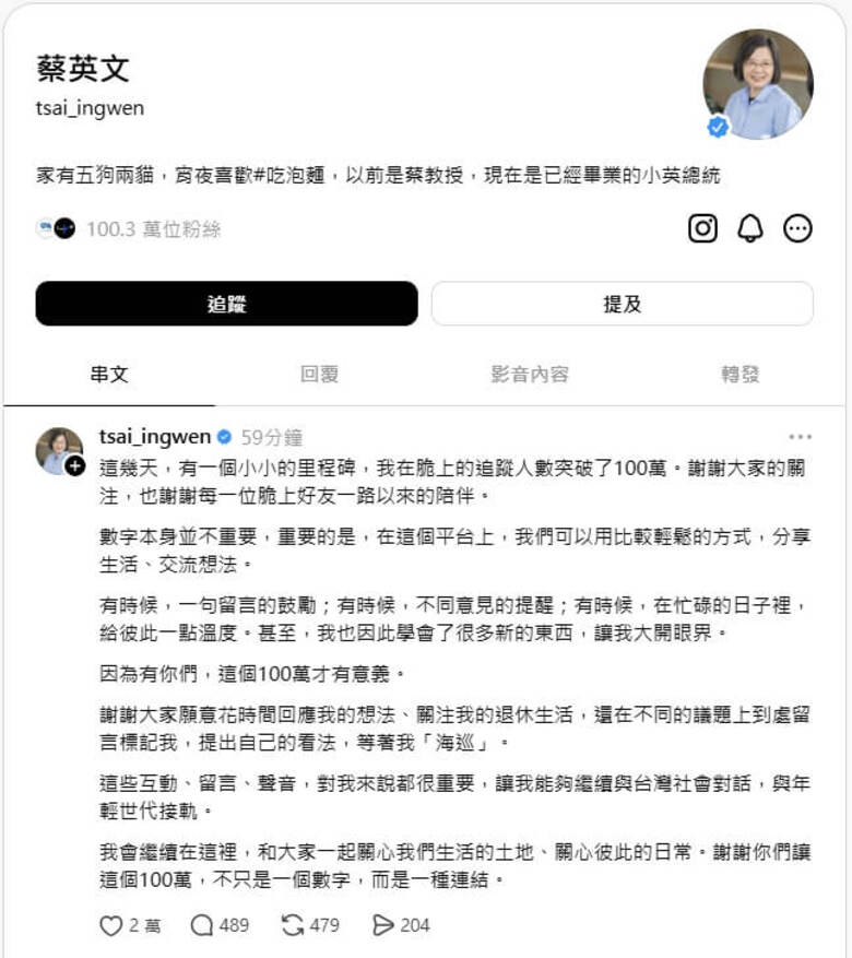 蔡英文在Threads發文表示,這幾天有一個小小的里程碑,她的追蹤人數突破100萬。數字本身並不重要,重要的是,在這個平台上大家可以用比較輕鬆的方式,分享生活、交流想法。