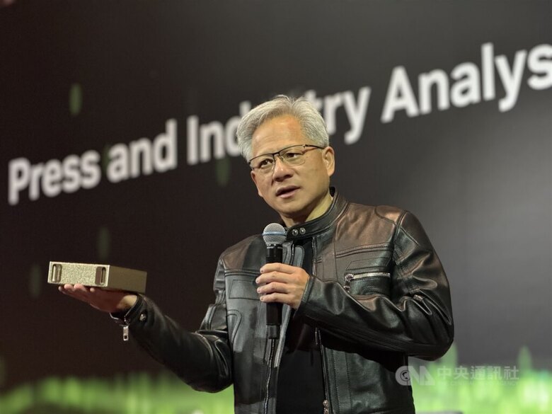 圖為輝達(NVIDIA)執行長黃仁勳2025年在COMPUTEX展示DGX個人人工智慧(AI)超級電腦。(中央社檔案照片)
