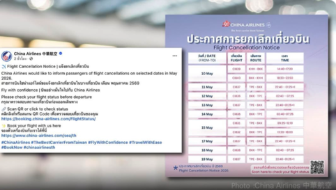 (台泰時報4月23日電)中華航空宣布,將於2026年5月期間取消部分航班,影響曼谷往返台北與高雄等航線。航空公司表示,此次為「部分日期與部分航班」調整,並建議旅客於出發前確認航班狀態,以避免影響行程安排。