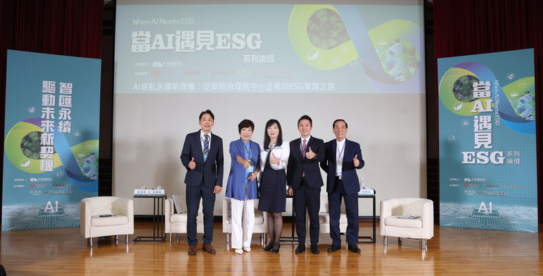 「當AI遇見ESG」系列論壇台北場22日舉行,由台師大永續管理與環境教育研究所教授李叢禎(中)擔任主持人,與一之軒食品有限公司創辦人暨總經理廖明堅(右)、中小企業信用保證基金總經理郭裕信(右2)、林銀杏國際有限公司創辦人林銀杏(左2)、光林智能科技股份有限公司總經理金海濤(左)等人座談。(中央社記者張新偉攝)
