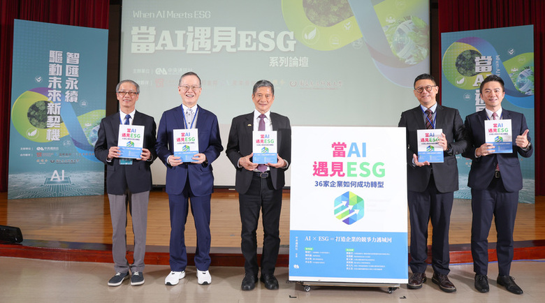 「當AI遇見ESG」系列論壇暨新書發表活動22日在台北舉行,中央社董事長李永得(左3)、台灣永續能源研究基金會董事長簡又新(左2)、經濟部主任秘書莊銘池(右2)與數位產業署長林俊秀(左)、中小企業信用保證基金總經理郭裕信(右)一同進行新書發表儀式。( 中央社記者張新偉攝)