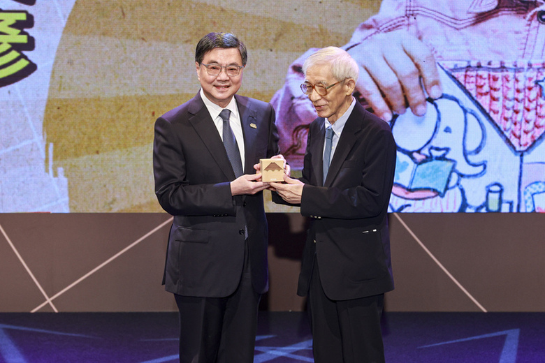 第1屆「金繪獎」頒獎典禮23日下午舉行,行政院長卓榮泰(左)頒發特別貢獻獎給被稱為「台灣兒童文學界點子王」的創作家曹俊彥(右),表彰他對台灣繪本發展卓著貢獻。(中央社記者鄭清元攝)