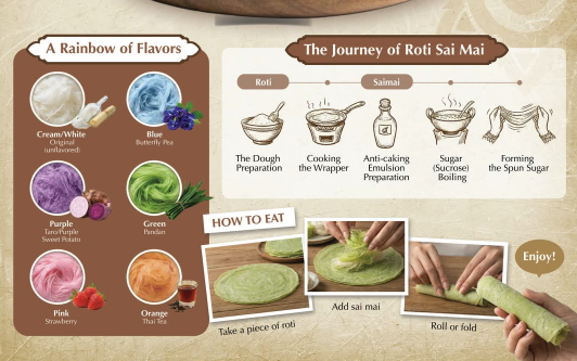 (台泰時報4月24日電)泰國大城府除以歷史遺跡聞名外,其地方甜點「羅提絲麥」(Roti Sai Mai)亦是重要文化象徵之一。這種以細絲糖包裹薄餅的甜點,不僅展現精細手工技藝,也反映當地社群的飲食傳承與多元文化背景。