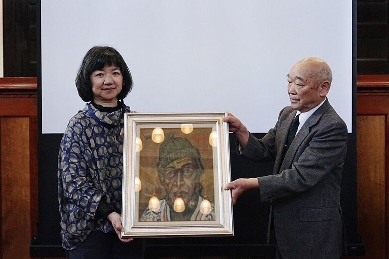 台南國家美術館籌備處25日在日本山口縣台日交流論壇活動,日本藝術家佐伯信夫門生藤崎恒賴(右)特別捐贈佐伯信夫作品「自畫像」給台南國家美術館,由文化部政務次長李靜慧(左)代表受贈。(文化部提供,中央社記者邱祖胤傳真)