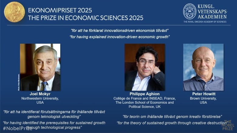 (中央社斯德哥爾摩13日電)2025年諾貝爾經濟學獎今天揭曉,由美、以雙重國籍學者莫基爾、法國學者阿吉翁、加拿大學者郝伊特3位學者共享殊榮,表彰他們「闡明了以創新為驅動的經濟成長」。