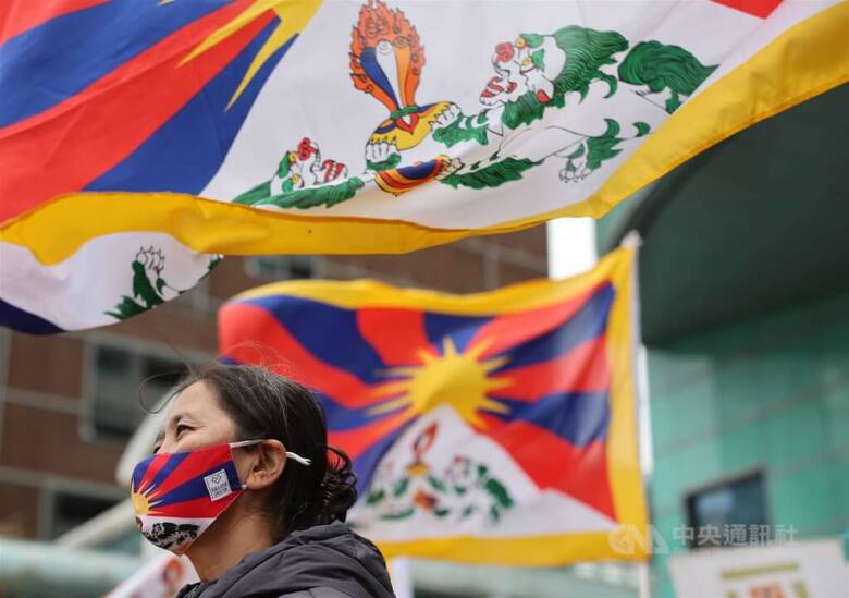 西藏抗暴67週年台灣大遊行3月7日在台北舉行,捷運忠孝復興站前集結的藏人團體揮舞旗幟表達守護達賴喇嘛轉世自主等立場。(中央社檔案照片)