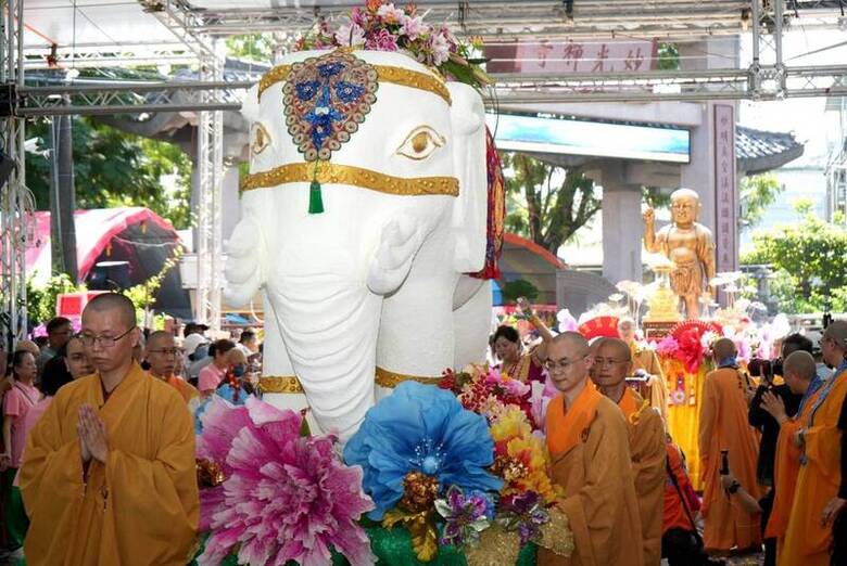台灣佛教總會、中華佛教比丘尼協進會及屏東縣佛教會26日在屏東舉辦「聯合各宗教浴佛大典」,各宗教團體進場後,太子聖像及六牙白象壓軸登場,為佛誕盛典增添繽紛意象與文化深度。(中央社記者黃郁菁攝)