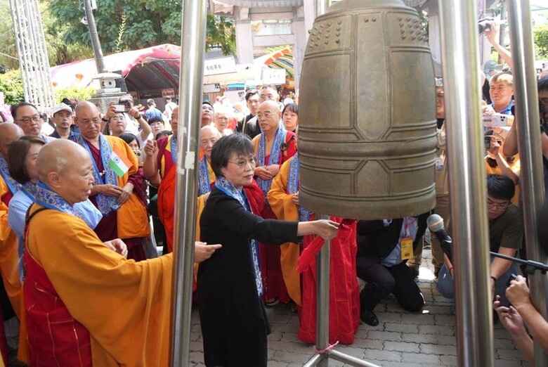 「聯合各宗教浴佛大典」26日在屏東潮州鎮妙光禪寺登場,內政部長劉世芳(前左2)典禮中叩和平鐘祈福。她表示,浴佛大典不僅凝聚信仰,更傳遞祈福與關懷。(中央社記者黃郁菁攝)
