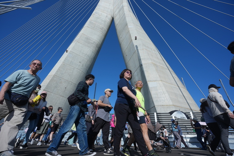 淡江大橋通車倒數,交通部公路局與新北市政府26日下午舉辦「在一起,走上橋」大遊行,吸引大批民眾參與,在通車前搶先感受這座世界級新地標魅力。(中央社記者徐肇昌攝)
