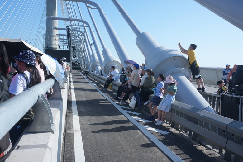 新北市淡江大橋開幕藝術季「在一起,走上橋」大遊行26日登場,下午從淡水漁人碼頭出發,民眾在淡江大橋通車前夕走上橋面,欣賞壯麗景色。(中央社記者徐肇昌攝)