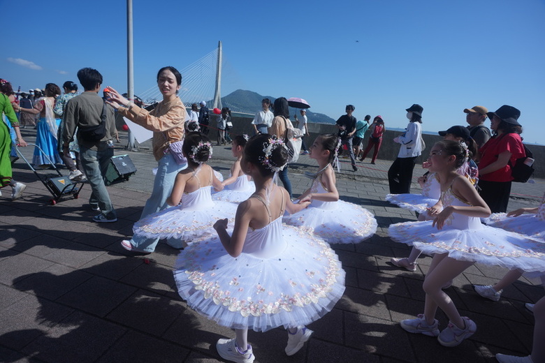 多名穿著芭蕾舞裝的學童26日在老師領導下,參與淡江大橋開幕藝術「在一起,走上橋」大遊行。(中央社記者徐肇昌攝)