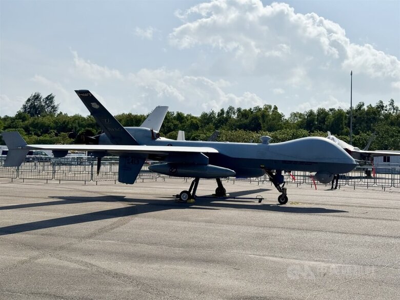圖為今年2月新加坡航展廠內的無人機MQ-9。(中央社檔案照片)