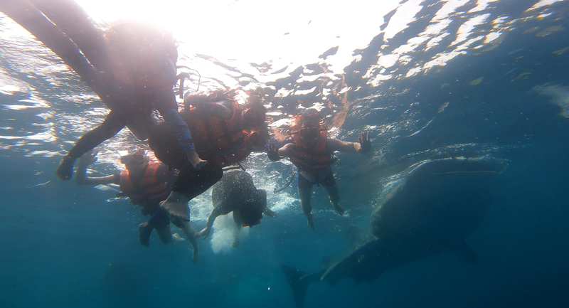 菲律賓中部大城宿霧市逐漸成為亞洲的熱門英語遊學據點。圖為學生在課後時間浮潛看鯨鯊。(業者提供,中央社記者林行健宿霧市傳真)