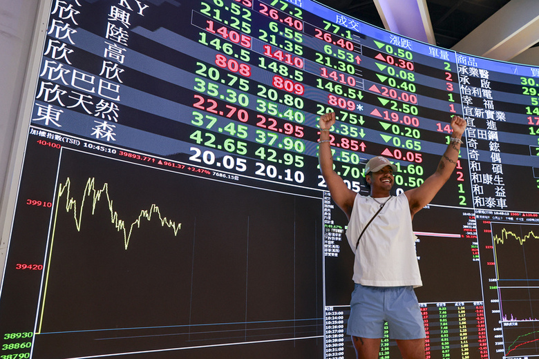 台北股市27日首度站上4萬點大關,加權指數續創歷史新高,市場氣氛熱絡,有民眾在證交所資訊看板前振臂歡呼。(中央社記者鄭清元攝)