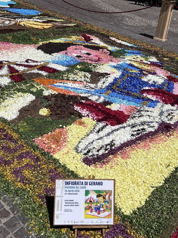 近年花毯主題愈來愈對應時事,今年除了在宗教角度,以新教宗良十四世為主軸,在世俗領域,也以花瓣排出可愛的木偶奇遇記主角「皮諾丘」(Pinocchio),紀念2026年是皮諾丘作者卡洛.科洛迪(Carlo Collodi)誕生200週年。