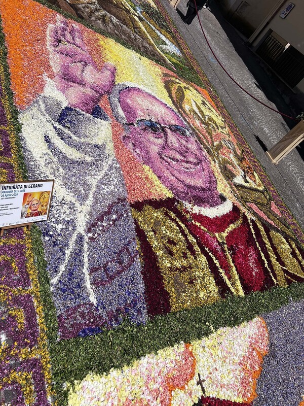 義大利傑拉諾花毯節今年一個創作主題是教宗良十四世,花毯節是以各色花瓣和葉片在地上鋪排成馬賽克般的藝術圖像。(中央社記者黃雅詩傑拉諾攝)