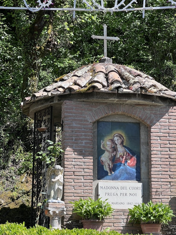 義大利傑拉諾花毯節起源是為了紀念當地教堂收藏的18世紀名畫聖母聖心像,相傳每次這幅畫要被遷走就會下雨,居民相信聖母選擇與居民同在。圖為進入小城前的聖母聖心像標示。(中央社記者黃雅詩傑拉諾攝)