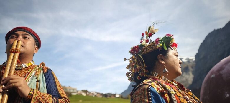 「月亮上的台灣」(Taiwan on the Moon)音樂表演日前在瑞士演出,原住民藝術家桑梅絹(右)悠遠澄澈的排灣族古調,搭配蔡清安(左)的排灣鼻笛,歌聲和樂聲繚繞阿爾卑斯山。(林育世提供,中央社記者郭芳君蘇黎世傳真)
