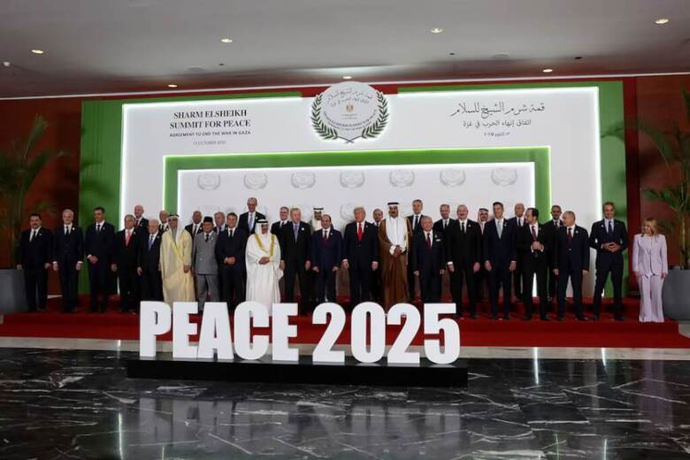 各國領袖13日在寫有「和平2025」(Peace 2025)的標語前合影,隨即舉行停火相關協議簽署儀式。(路透社)