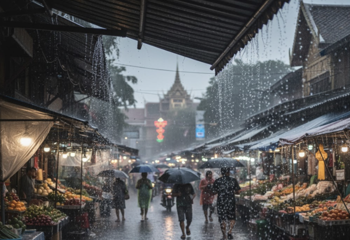 根據氣象局公告,東風氣流從南海帶來濕潤氣團,覆蓋泰國東北、東部、中部與北部地區,同時上部南部受季風槽影響,雨勢持續增強。東部沿海地區如那空那育、巴真武里、沙繳、春武里、羅勇、尖竹汶及達叻等府,將有局部豪雨甚至特大暴雨,民眾須提防突發性淹水與山洪。