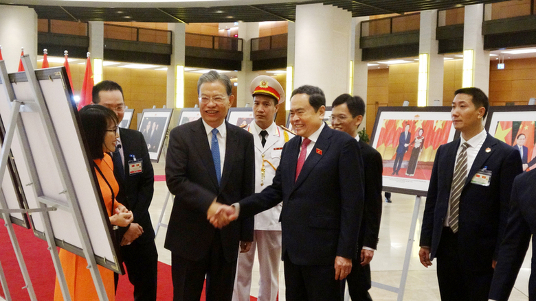 越南務實外交與所有國家交好,並因經濟發展壓制民族主義,中國在越南的形象近年也逐漸好轉。圖為越南國會主席陳青敏(右)8月31日與中共全國人大常委會委員長趙樂際(左)共同欣賞越中關係照片展,反映兩國關係升溫。(中央社記者曾婷瑄河內攝)