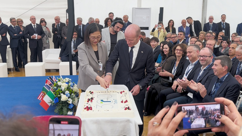 環球晶董事長徐秀蘭(灰色西裝者)15日出席北義諾瓦納新廠開幕典禮,舉行切蛋糕儀式。(中央社記者黃雅詩諾瓦納攝)