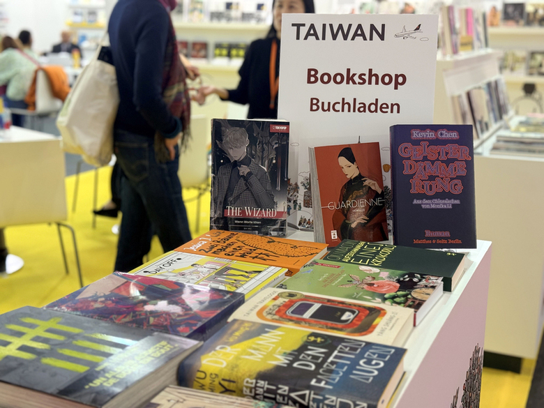 今年法蘭克福書展首度開放現場書籍販售,台灣館書店區也展示多部台灣作家作品的德語譯本,包括吳明益《複眼人》、蕭瑋萱《成為怪物以前》、小峱峱《守娘》與陳思宏的《鬼地方》等。(中央社記者林尚縈法蘭克福攝)
