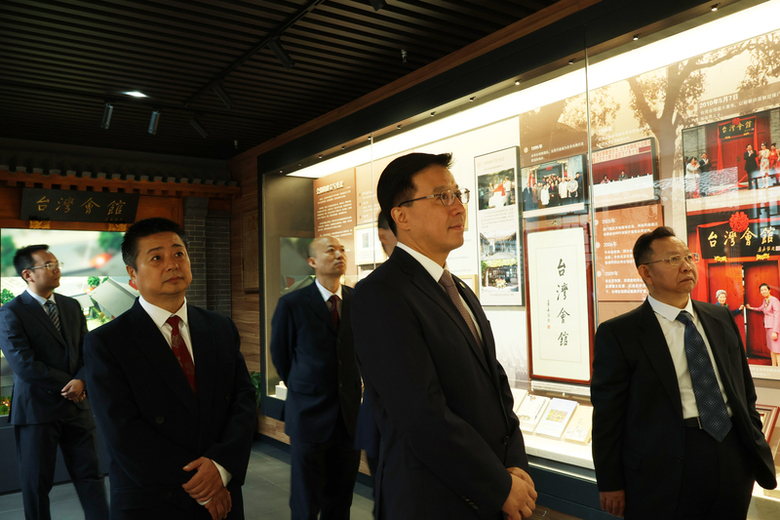 中國大陸17日在北京的台灣會館舉辦「紀念台灣光復80週年書畫展」,國台辦副主任趙世通(前中)在開幕式前參觀北京的台灣會館。(中央社記者謝怡璇北京攝)