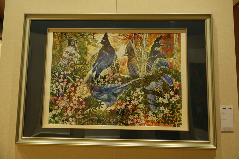中國大陸17日在北京的台灣會館舉辦「紀念台灣光復80週年書畫展」。圖為旺旺集團副董事長、前台北縣長周錫瑋畫作「鳥語花香」,在展覽中展出。(中央社記者謝怡璇北京攝)