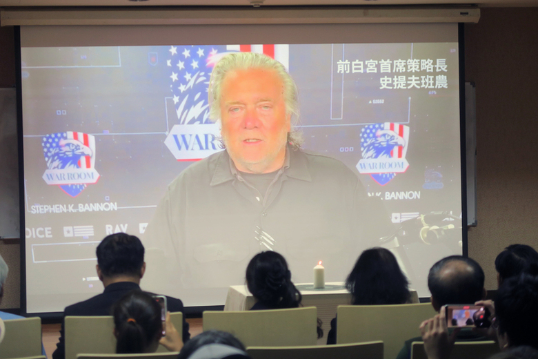 福和會18日舉辦「愛、信念、勇氣-查理柯克紀念會」,美國總統川普前首席策士巴農以預錄影片致詞。(中央社記者吳書緯攝)
