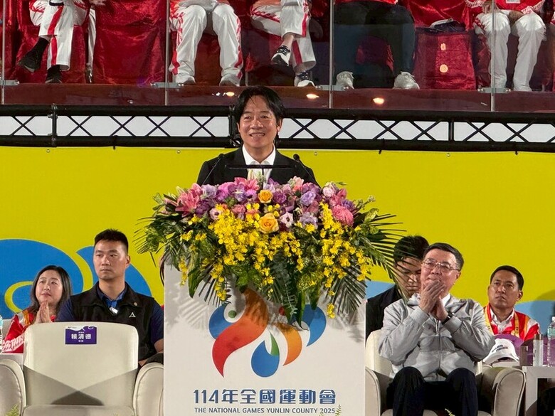 總統賴清德(前中)18日晚間在雲林參加114年全國運動會開幕式,他在致詞時表示,中央政府除重視運動以外,也重視教育,透過教育栽培人才,「人才多、人才好,國家社會才會更好。」(中央社記者姜宜菁攝)