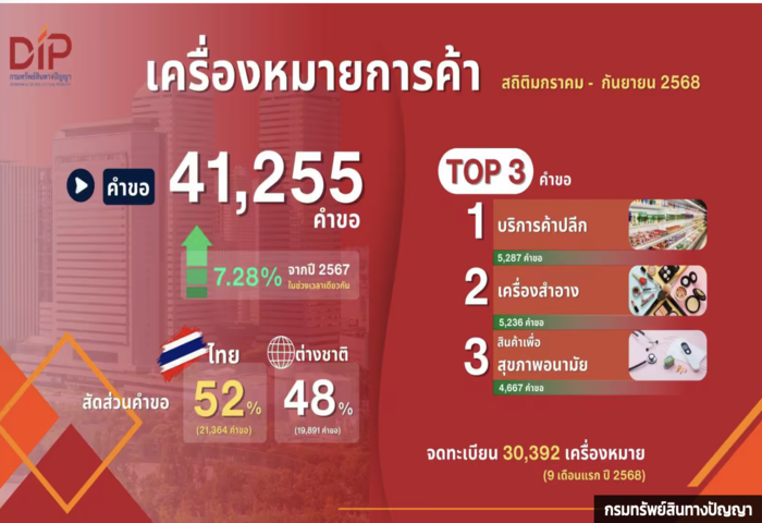 (台泰時報10月20日電)泰國智慧財產局公布最新統計,今年前九個月(1月至9月)全國智慧財產登記申請共計55,699件,較去年同期成長7.46%,顯示企業與創業者對智慧財產權保護意識明顯提升,尤其以健康與環保相關商品最受關注。