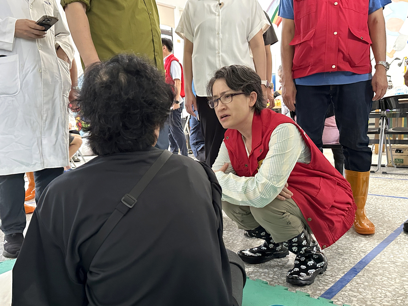 花蓮馬太鞍溪堰塞湖溢流,釀多人死傷。副總統蕭美琴(右)24日到光復鄉大進國小收容中心傾聽災民心聲,希望讓鄉親早日恢復正常生活。(中央社記者李先鳳攝)
