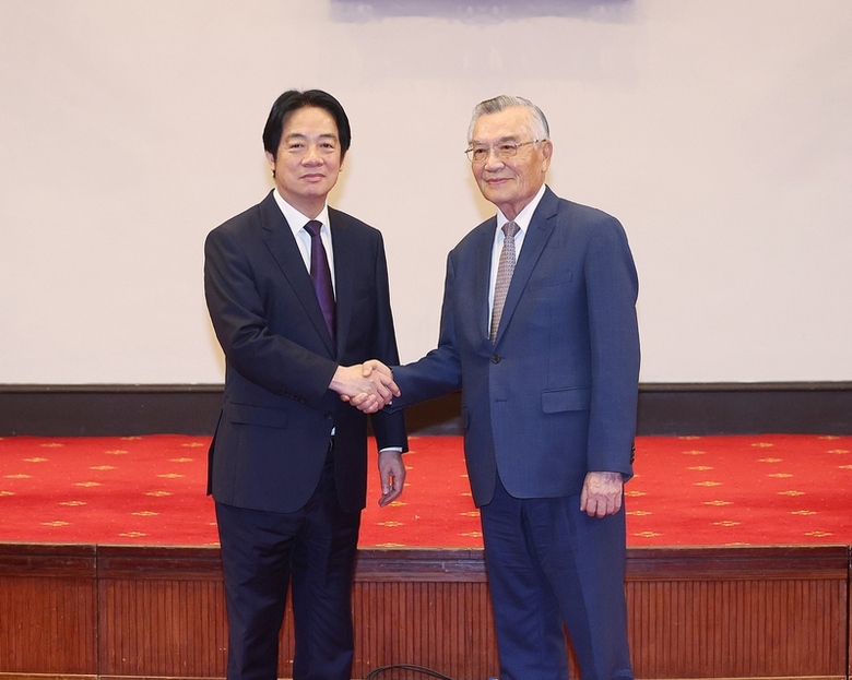 圖為總統賴清德(左)21日下午出席2025亞太經濟合作(APEC)經濟領袖會議(AELM)代表團行前記者會,與領袖代表林信義(右)握手合影。(中央社檔案照片)