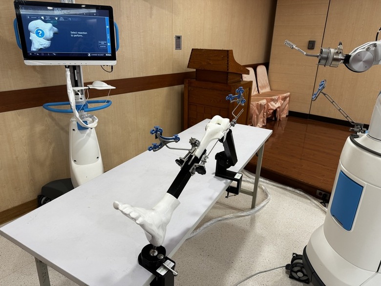 關節用久了難免退化,換人工關節是選項之一,馬偕醫院導入AI機械手臂輔助手術技術,可縮小傷口同時精準切割,降低出血與疼痛,恢復快、併發症更少。(中央社記者沈佩瑤攝)