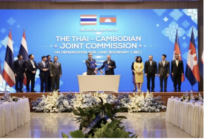 (台泰時報10月23日電)泰柬邊界委員會(JBC)於22日晚間在泰國尖竹汶府結束兩日特別會議,雙方同意修復受損界碑15處、更新2003年技術指引(TOR),並採用光達測繪技術(LiDAR)加速邊界測繪工作,同時推進解決沙繳府「農占」(Nong Chan)與「農雅拷」(Nong Ya Khaew)兩村土地歸屬問題。