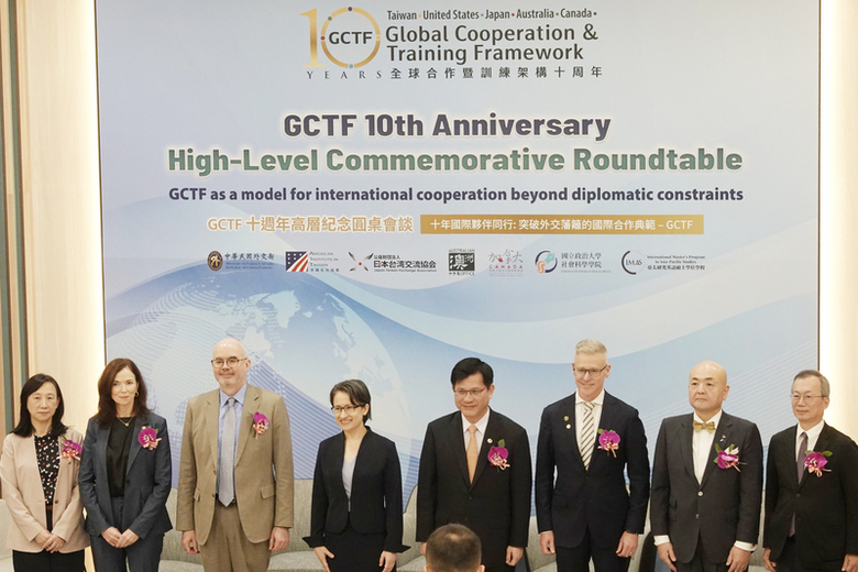 全球合作暨訓練架構(GCTF)成立10週年圓桌論壇23日登場,副總統蕭美琴(左4)、外交部長林佳龍、美國在台協會(AIT)處長谷立言(Raymond Greene,左3)、日本台灣交流協會代表片山和之(右2)、澳洲駐台代表馮國斌(Robert Niel Fergusson)(右3)以及加拿大駐台代表何曼麗(Marie-Louise Hannan)(左2)出席與會。(中央社記者楊堯茹攝)